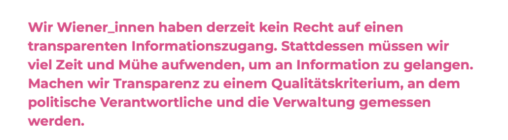 Die NEOS fordern in ihrem Wahlprogramm ein fortschrittliches Informationsfreiheitsgesetz für die Stadt Wien. Auch auf Bundesebene haben sie einen Entwurf für ein Informationsfreiheitsgesetz im Nationalrat eingebracht. Auf Seiten der SPÖ gibt es einen einstimmigen Beschluss für ein Wiener Transparenzgesetz vom SPÖ-Landesparteitag 2013. Außerdem fordert die SPÖ von der Türkis-Grünen Bundesregierung eine Zweiwochenfrist für ein Bundes-Informationsfreiheitsgesetz. Die Forderungen von SPÖ und NEOS sind also nicht so weit voneinander entfernt, wie die intransparente Verwaltungspraxis in Wien vermuten lassen würde.
